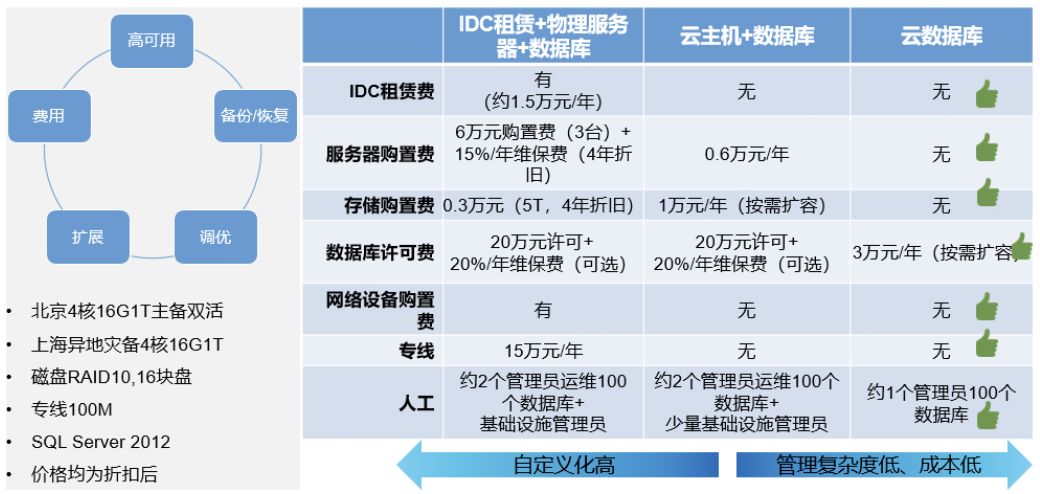 毫无疑问,你可以选择自己搭建一套同城热备的高可用数据库,操心:租机柜、买服务器、配置服务器、配置存储、安装操作系统、安装并配置数据库、配置异地通信。无论从管理上还是周期上考虑,都很头疼。虽然你也可以选择把这一切都事先准备好,但是这意味着浪费。而云数据库:默认跨机架的热备高可用配置,数十秒建立完毕,可选跨机房配置;自动故障转移,一键主备切换,同时IP自动漂移;服务器硬件方面,我方负责监控与维护。本地磁盘16块盘RAID10,磁盘损坏问题无需用户操心。SQL 高可用方案,包括SQL集群、日志传输、数据复制、AlwaysOn、镜像。主备间的日志是内网级别的传输速度,磁盘是16块盘组成的SSD,理论上可以达到数十万的IOPS。(单块盘,顺序读:540M/s,顺序写300M/s,随机读8万 IOPS,随机写3万IOPS;RAID10,8块固态磁盘并行工作的性能)