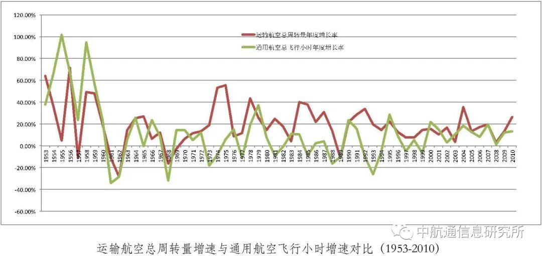从1972年到2010年的29年中,除少数年份外,运输航空的增长速度一直高于通用航空增长速度,根据这一速度差计算,假设1972年中国民航运输航空与通用航空规模为1:1,那么到2010年两者体量相差了133.3:1,通用航空仅为运输航空规模的0.75%。