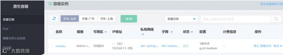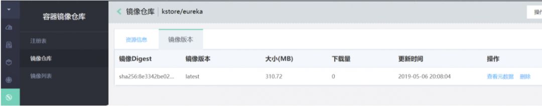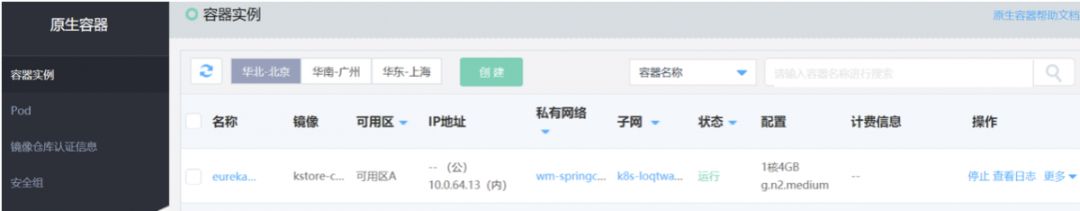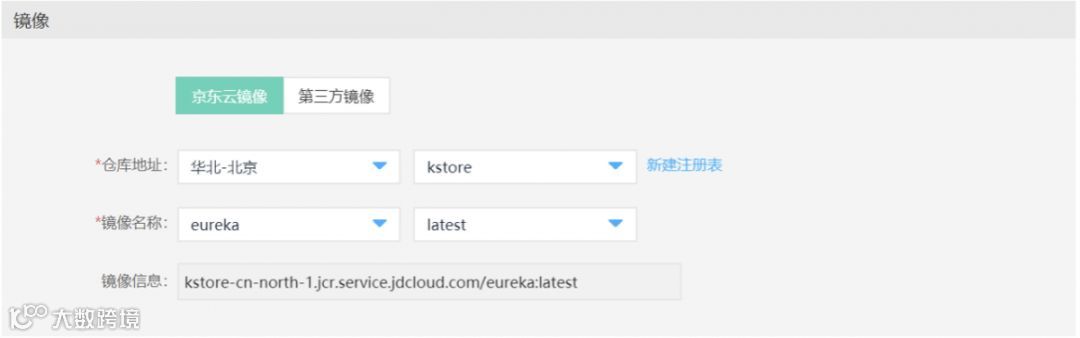 注册表为kstore,镜像仓库为eureka,镜像版本号为latest,地域选择华北-北京为cn-north-1。用户可根据具体情况修改。