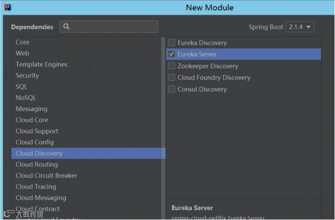 下一步,选择Cloud Discovery,加入Eureka Server组件