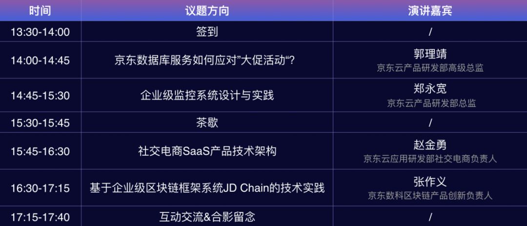 2、如何在业务高峰的场景下高性价比完成需求等技术详情,并配合京东电商具体的生产实践加以说明,让开发者做到更深入了解数据库选型的基本方法、高可用架构与性能优化的诸多模式等,并提供超大流量场景下系统保障的经验与技巧。
