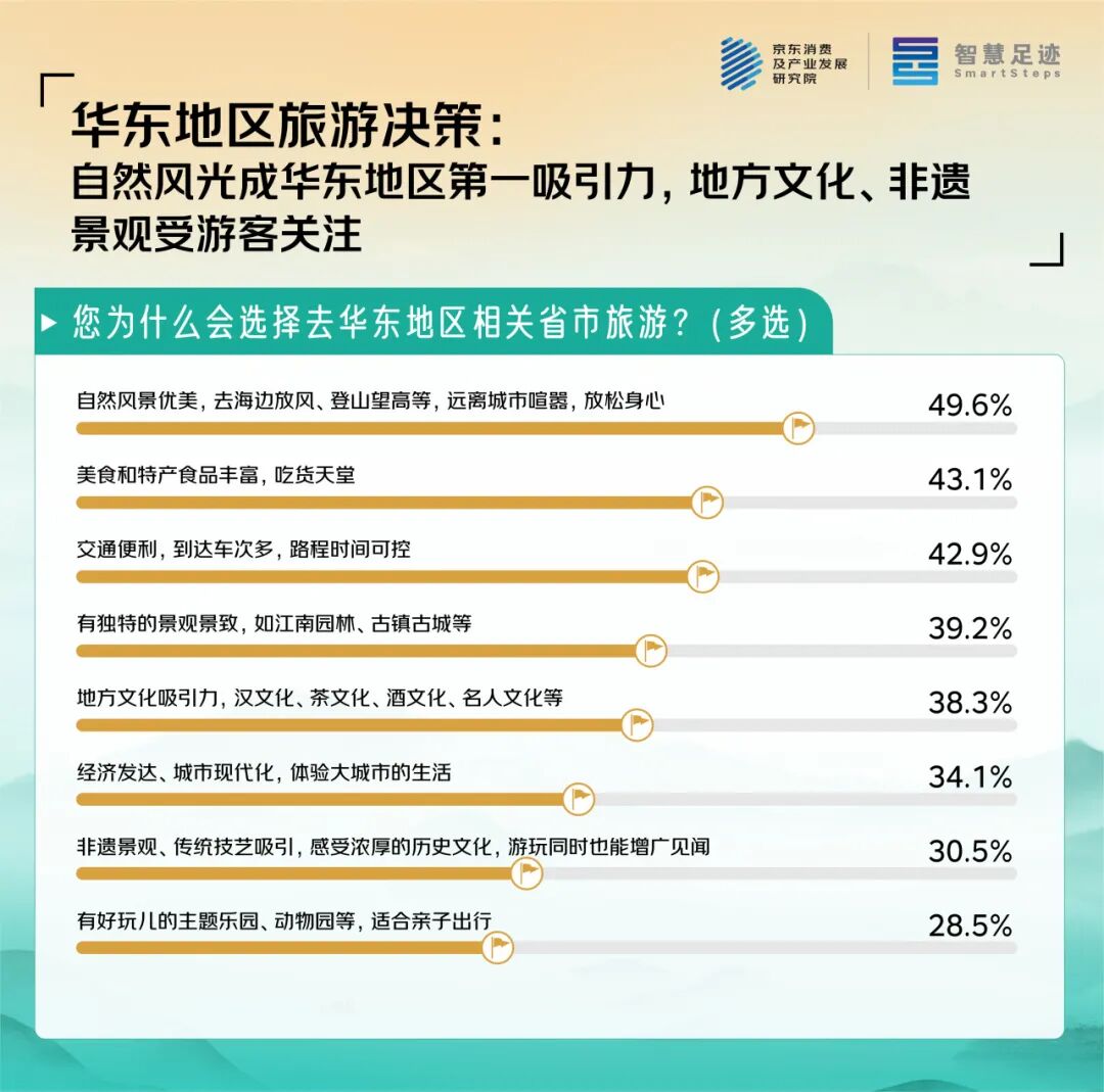 事实上,华东地区丰富的资源正在成为吸引游客的重要因素,文化体验已经成为游客选择的核心驱动力之一。京东调研显示,在“为什么会选择华东地区旅游”的原因中,“自然风景优美”以49.6%的占比高居首位,其次有43.10%的人选择“美食和特产丰富”、42.9%的人选择“交通便利”,值得关注的是,有38.3%的人认为华东地区“地方文化有吸引力”,且30.5%的人被华东地区“非遗景观、传统技艺”吸引,可见,来到华东地区进行深度文化体验已成为促使游客进行决策的重要因素。