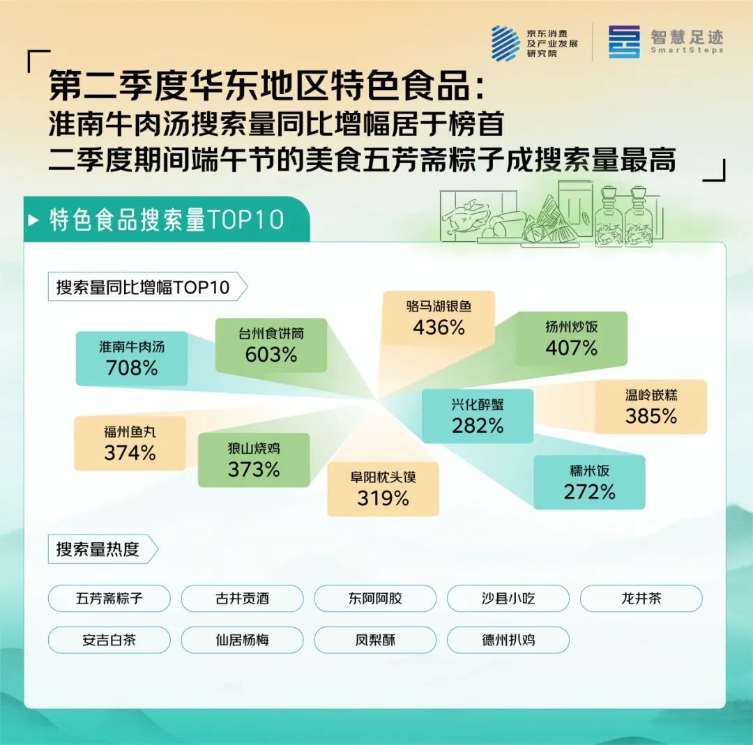 “舌尖上的旅行”也成为旅游新风尚,华东地区充满烟火气与文化味的地方美食,吸引消费者开启“味蕾游”。在特色美食方面,淮南牛肉汤、台州食饼筒、骆马湖银鱼、扬州炒饭等在京东的搜索量也呈现出数倍增长的趋势。