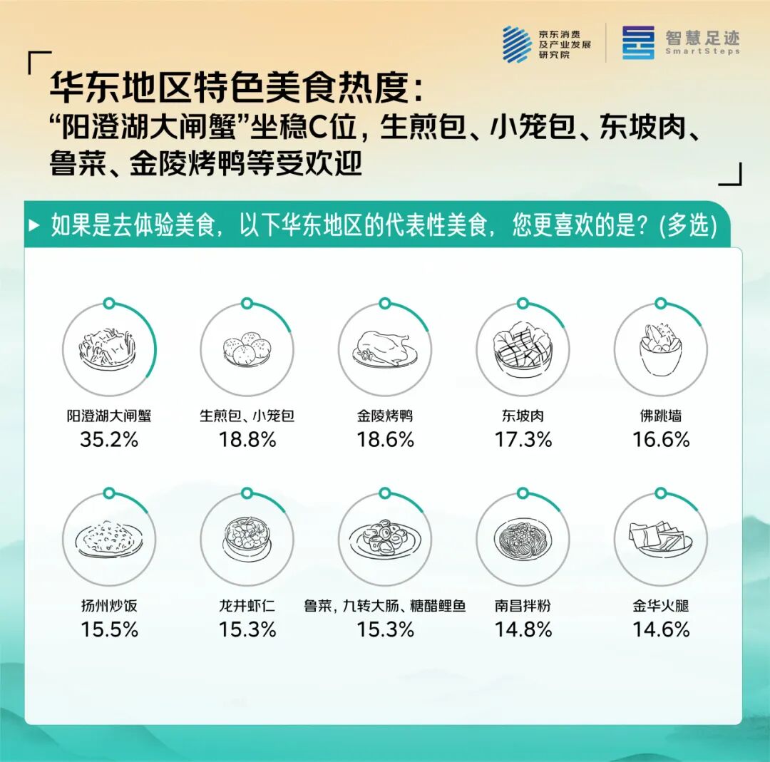 “民以食为天”,以“逛吃”为主的美食之旅,为华东地区带来“吃出来的经济蓬勃”,旺盛的特产消费特色鲜明。京东调研显示,在大家“想体验的华东美食”中,阳澄湖大闸蟹凭借35.2%的高占比稳居首位,其次是18.8%的人选择生煎包、小笼包、18.6%的人选择金陵烤鸭、17.3%的人选择东坡肉和16.6%的人选择佛跳墙,它们共同构成了“必吃榜”Top5,“美食体验”对游客具有重要吸引力,直接带动当地特产销量。