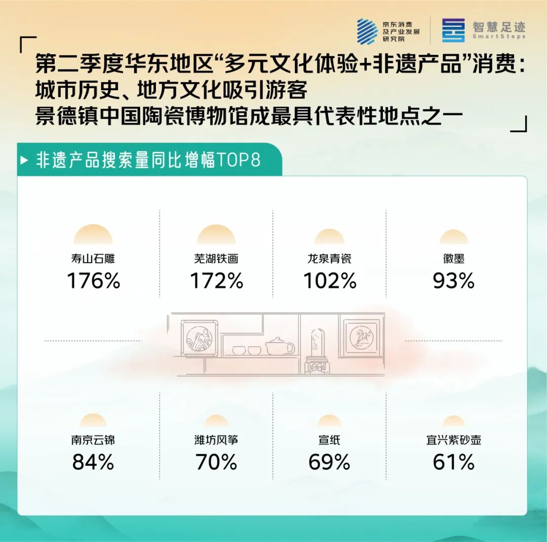 华东地区坐拥丰富的景观与文化资源,这些不仅承载着深厚的历史底蕴,其创新转化也释放出巨大消费动能,非遗元素及特色工艺技艺显著提升着地方特产的附加值。华东地区热门特产如宜兴紫砂壶、景德镇陶瓷、潍坊风筝,既是实用品也是文化载体,其深度嵌入文旅消费链条,阐明非遗资源转化为消费产品的明确路径,成为颇受关注的消费增长点。观察显示,第二季度多种非遗产品在京东的搜索量有所增长,京东数据显示,寿山石雕、芜湖铁画和龙泉青瓷是搜索量同比增幅TOP3的非遗产品,同比增幅分别为176%、172%和102%,徽墨、南京云锦、潍坊风筝等搜索量也有亮眼的增幅。在工艺品方面,金坛刻纸、邳州玉雕、徽州三雕、南昌瓷板画等的搜索热度均实现了数倍增长。