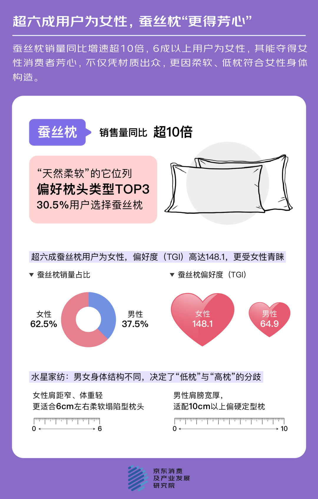 蚕丝枕赢得女性青睐, 女性偏好度超平均50%,销量同比增速超10倍,这不仅因其自然材质,更因柔软、低枕符合女性身体构造。
