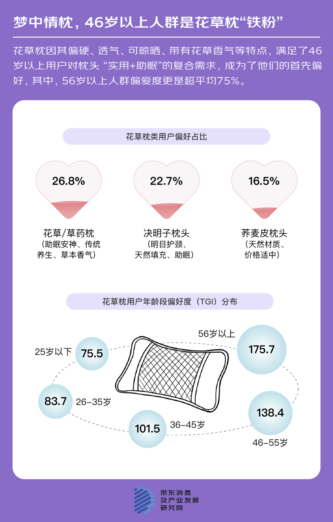 决明子、稻谷壳、艾草、薰衣草……花草枕的填充物五花八门,在新材料、新功能层出不穷的枕头市场里杀出重围,看似传统的花草枕也有它的稳定“铁粉”。调研数据显示,26.8%的用户依然偏好花草/草药类枕头,其中以46岁以上人群为主,京东数据显示,在46-55岁人群中,花草枕的偏好度比整体人群高出38%,在56岁及以上人群中,这一比例甚至高出75%。
