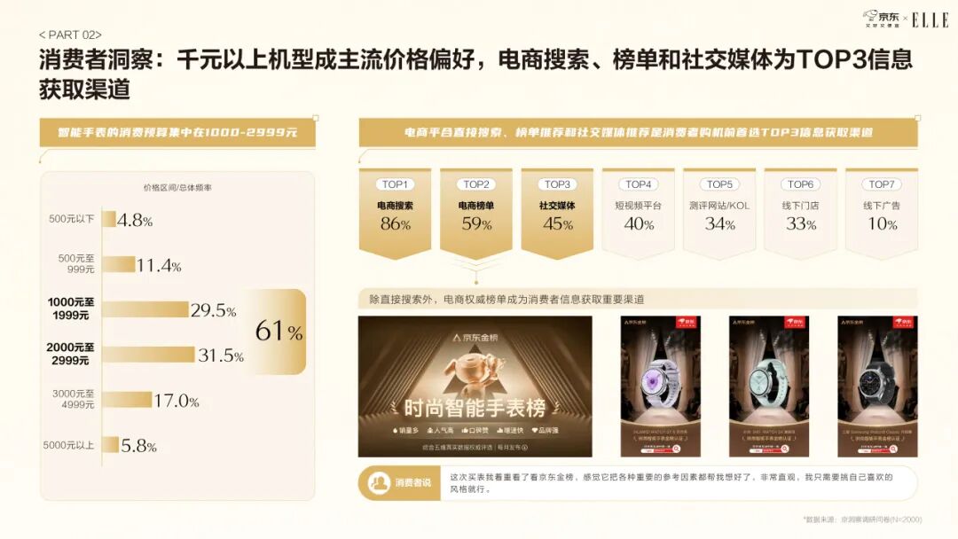 调研显示,千元以上智能手表已经成为大多数人预算的范畴,在购表前,电商搜索、电商榜单推荐和社交媒体成为用户搜集信息,影响用户决策的TOP3渠道。