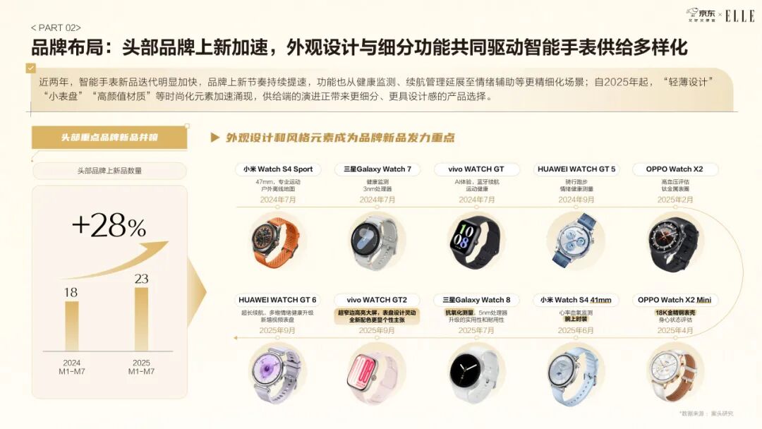 供给侧的演进则进一步推动了市场活力的释放。近两年,头部品牌的新品节奏显著加快,2025年前七个月头部品牌新品数量同比增长28%。在竞争加剧和消费需求不断细分的背景下,品牌正以“设计创新”为核心路径,推动智能手表从“科技设备”向“时尚单品”转变。