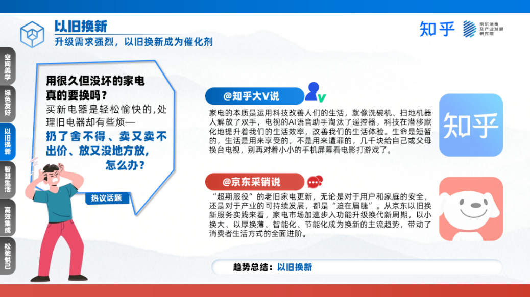 在知乎上,家电数码以旧换新话题引起大家广泛热议,相关内容讨论量、讨论指数大幅增长。