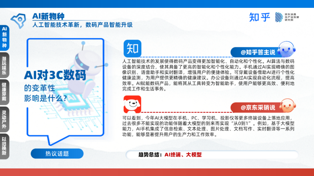 近日,针对家电数码领域的诸多热议话题,京东采销携手知乎答主,通过多维度的观点碰撞,带来了第一线的家电数码热门关注话题与消费趋势解读,并发布了《2024家电数码趋势洞察白皮书》。