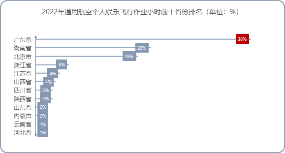 在个人娱乐飞行市场,广东省占据了较大的市场份额,作业量全国第一,占比达到38%, 直接体现了粤港澳大湾区的市场空间和消费基础。截至2022年底,广东省通航类注册企业数量已达到18828家左右,通航类企业续存在册统计排名全国第一,占比22.4%,这也和广东的娱乐飞行作业比例形成了正向呼应。湖南省的个人娱乐飞行占比达到20%, 排名第二,北京市排名第三,占比达到18%。其余省份占比均为个位数。