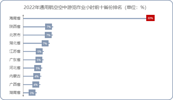 在空中游览市场,海南省作业小时排名第一,全国占比达30%,份额远高于全国其它省市,陕西省和北京市分列第二、第三,约占7%的比例(由于表格篇幅及排版风格因素,占比排名中小数点后四位未显示)。海南省是我国低空空域改革试点省份,随着《海南省通用航空产业发展“十四五”规划》的逐项落实,《海南省关于促进通用航空发展的若干支持措施》正式印发,海南全面启动封关运作准备,不断出台的优惠政策和利好信息也吸引越来越多的通航企业入驻海南,加之良好的自然资源禀赋,为海南省的空中游览市场奠定了良好的基础和发展空间。