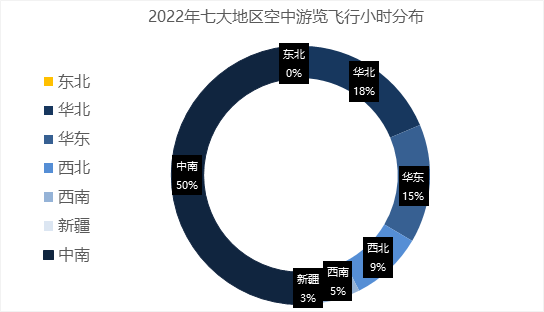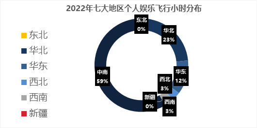 通用航空消费市场主要包括私照培训、运动照培训、跳伞、空中游览、个人娱乐飞行、航空科普研学等。其中2022年通航空中游览作业共有142家企业参与,通航跳伞作业共有20家企业参与,通航个人娱乐飞行作业共有30家企业参与,从全国七大地区飞行小时分布来看(七大区按中国民用航空局七大地区管理局划分),排名前三的地区分别是中南区、华北区、华东区,值得一提的是在跳伞、个人娱乐、空中游览领域,中南区(包括河南省、湖北省、湖南省、广西壮族自治区、广东省、海南省)所占比例均超过50%,占据了全国通航消费市场的半壁江山,在一定程度上也间接反映出中南区活跃的市场需求和较高的增长潜力。