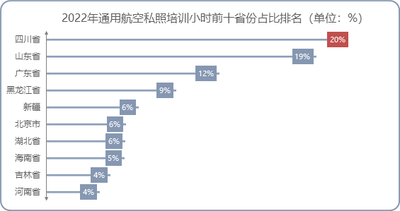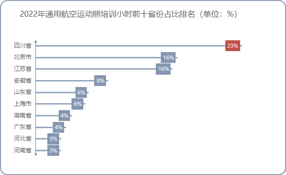 在飞行执照培训市场,2022年的运动照和私照培训小时数量四川省占比排名第一,主要源于这里坐落着亚洲最大的飞行人才教育培训基地——中国民用航空飞行学院,以及一批从事飞行培训的企业单位;北京市和江苏省分列第二、第三,约占16%的比例(由于表格篇幅及排版风格因素,占比排名中小数点后四位未显示)。从民航局云执照系统数据统计来看,民航运动照当年颁发数量达1456本,比上年增长了43.3%,虽然疫情限制了人员流动,但也给执照培训带来了难得的契机。