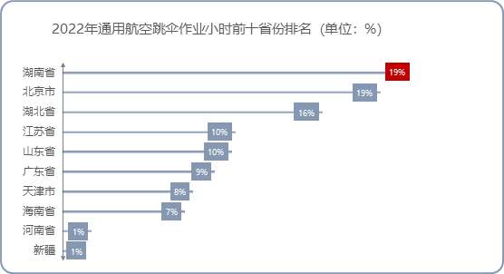 在跳伞市场,湖南省位列第一,占比达到19%,北京市和湖北省分列第二、第三,约占19%、16%的比例(由于表格篇幅及排版风格因素,占比排名中小数点后四位未显示)。湖南省地貌以山地、丘陵为主,平原面积仅占13%,原本相对于跳伞环境并不具有较大优势,甚至考虑气候等因素往往给人以劣势居多的第一印象,然而依然实现全国占比第一,充分说明了地理地貌并非是影响产业发展的决定性因素,“事在人为”往往起到关键作用,包括当地机构领导的发展意愿,区域产业定位,市场营商环境、招商引资措施等,这些因素的集聚融合往往会给当地带来良性、稳健、高效、持久的发展环境。