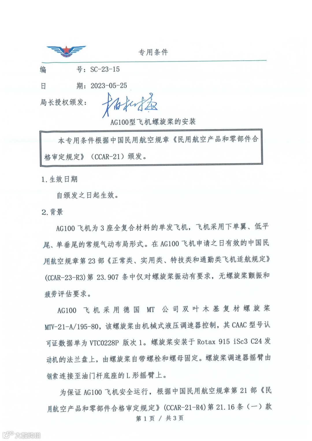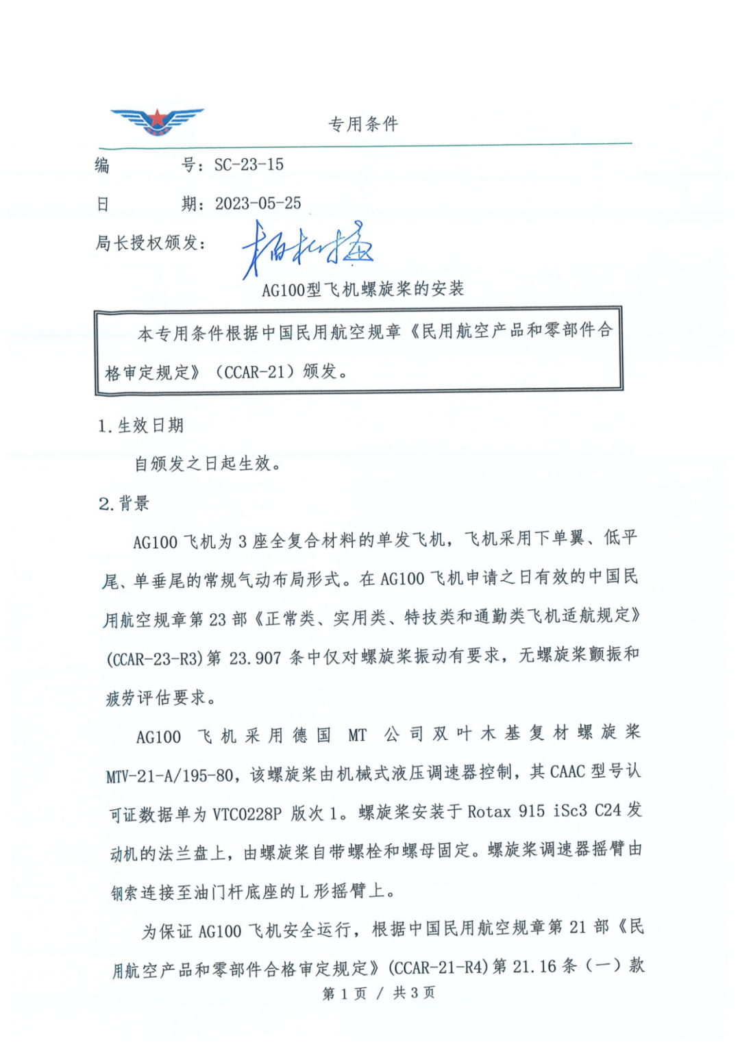 以下为《AG100型飞机螺旋桨的安装》(SC-23-15):