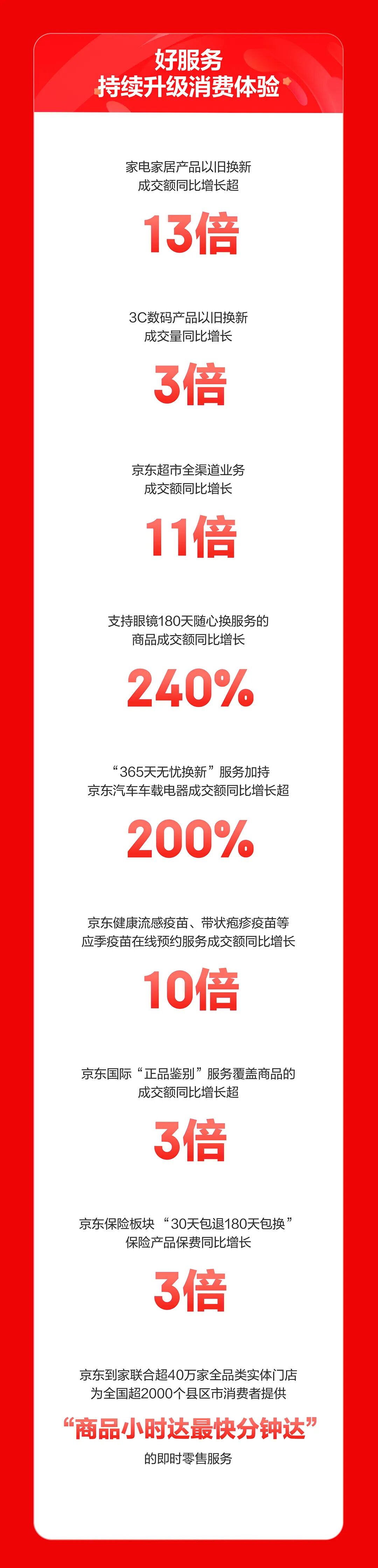 保险服务为消费者购物体验提供了进一步的保障。10月23日晚8点开售10分钟,京东保险业务板块保费规模同比增长50%,“30天包退180天包换”保险产品保费同比增长300%,为消费者购买3C数码、家用电器、家居类等商品提供无忧保障服务。