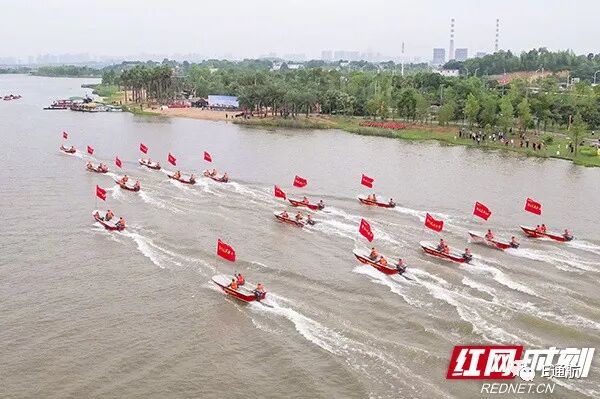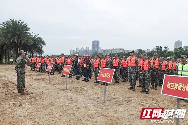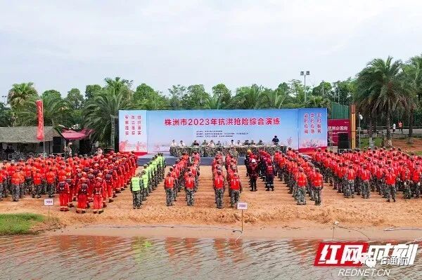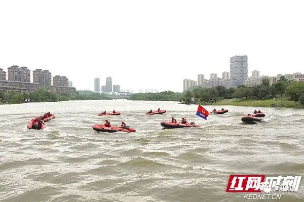 6月17日,株洲市300余名抗洪抢险民兵、消防和应急救援人员集结天元区万丰湖,参加抗洪抢险综合演练。株洲市军地领导现场观摩。