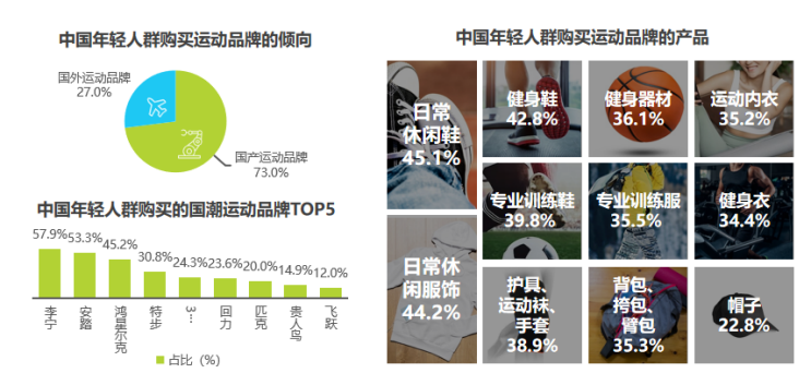 报告显示,篮球、足球、羽毛球、跑步、健身、瑜伽、滑雪、露营作为当下最受年轻人青睐的八大运动,大众的参与方式和消费习惯各有特点,但追求专业性成为最大共性。中国年轻人群在购买运动装备时相对更加偏好国产运动品牌,李宁、安踏、鸿星尔克、特步等主流国潮品牌更受到年轻人群的欢迎。