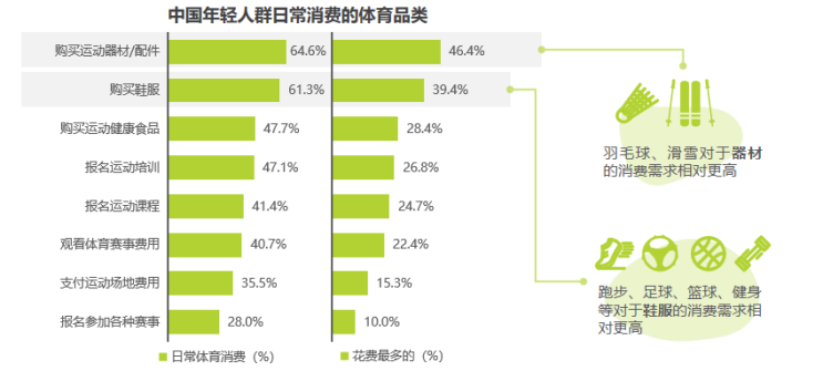 《白皮书》显示,年轻消费群体更注重运动专业性,愿为“专业”买单;运动器材、鞋服、健康膳食成为当代年轻人群的“运动三大件”;篮球、足球、羽毛球、跑步、健身、瑜伽、滑雪、露营作为当下年轻人青睐的八大运动,消费特点各异但都追求专业性;国潮运动品牌受到越来越多年轻消费者偏爱;一站式专业体育服务平台成为运动消费首选。同时,年轻群体的运动消费也体现爱好多元化、运动培训课程进一步分化、运动装备迎来自主和智能时代、各类体育赛事IP多点开花、体育服务平台向一站式跃迁的五大趋势。
