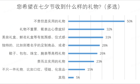 在为爱人准备礼物时,人们总会觉得对方的“心意盲盒”有点难猜。在回答“您希望在七夕节收到什么样的礼物?”的问题时,50%的受访者期待“不贵但是实用的礼物”,31%的受访者期待“美妆礼盒、鲜花礼盒等有氛围感、仪式感的礼物”,32%的受访者表示“礼物不重要,能表达心意就好”。