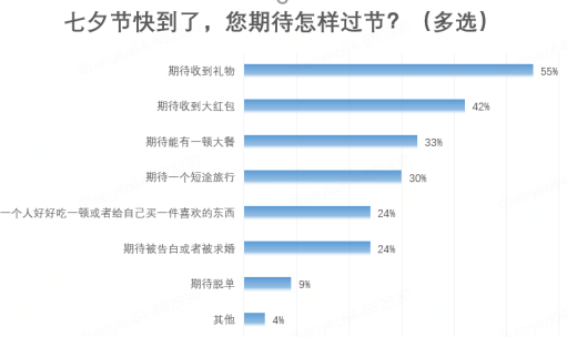 七夕节快到了,您期待怎样过节?55%的受访者期待“收到礼物”,42%的受访者期待“收到大红包”,超过30%的受访者期待“一顿大餐”或“一个短途旅行”。