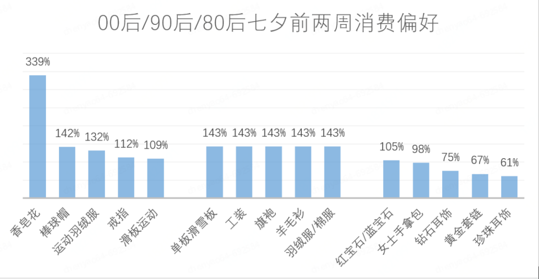 不同年龄的人群有着不同的生活观、爱情观,在七夕礼品的选择上也呈现出明显的差异。七夕节前两周,在与全站整体消费的对比中,00后在棒球帽、滑板运动等商品的消费偏好较高,体现出年轻一代的青春与活力;90后在工装、旗袍、羊毛衫等商品的消费偏好较高,体现出非常现代的时尚风格;80后在红宝石/蓝宝石、钻石耳饰、黄金套链等商品的消费偏好较高,更愿意选择首饰类商品作为七夕节礼物。