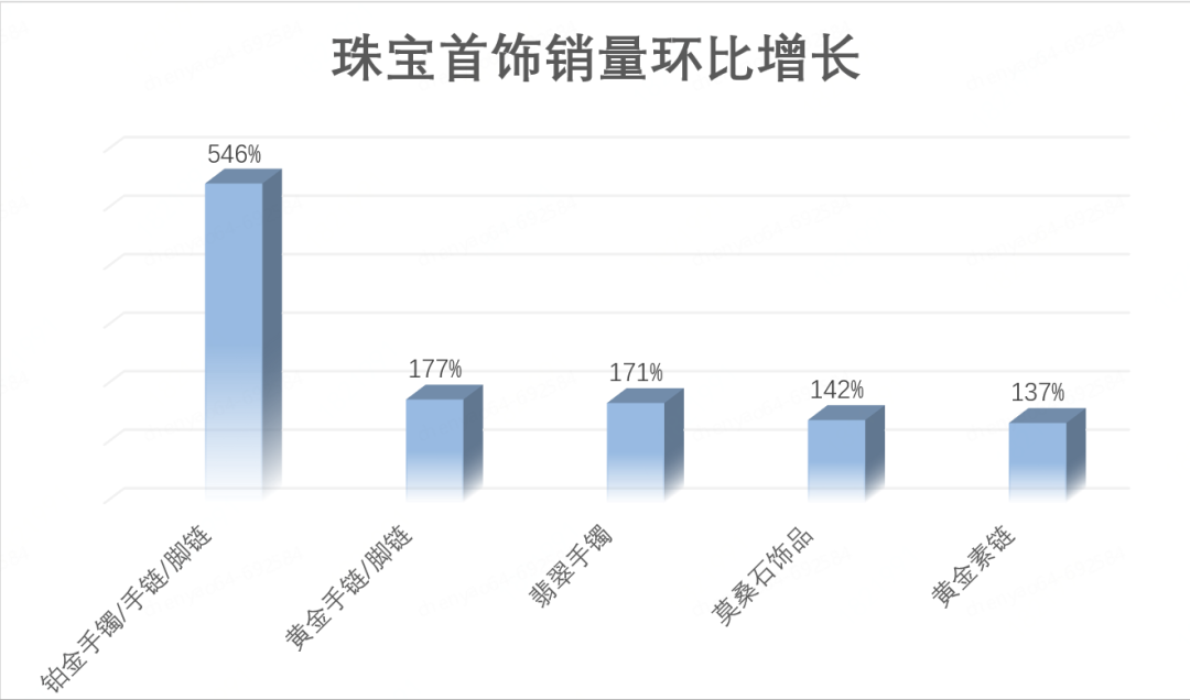 在大品类中,珠宝首饰的销量环比增长最高,翡翠、黄金饰品销量环比增长90%。在细分品类中,铂金手镯/手链销量环比增长546%,黄金手链、翡翠手镯销量环比增长超过170%。
