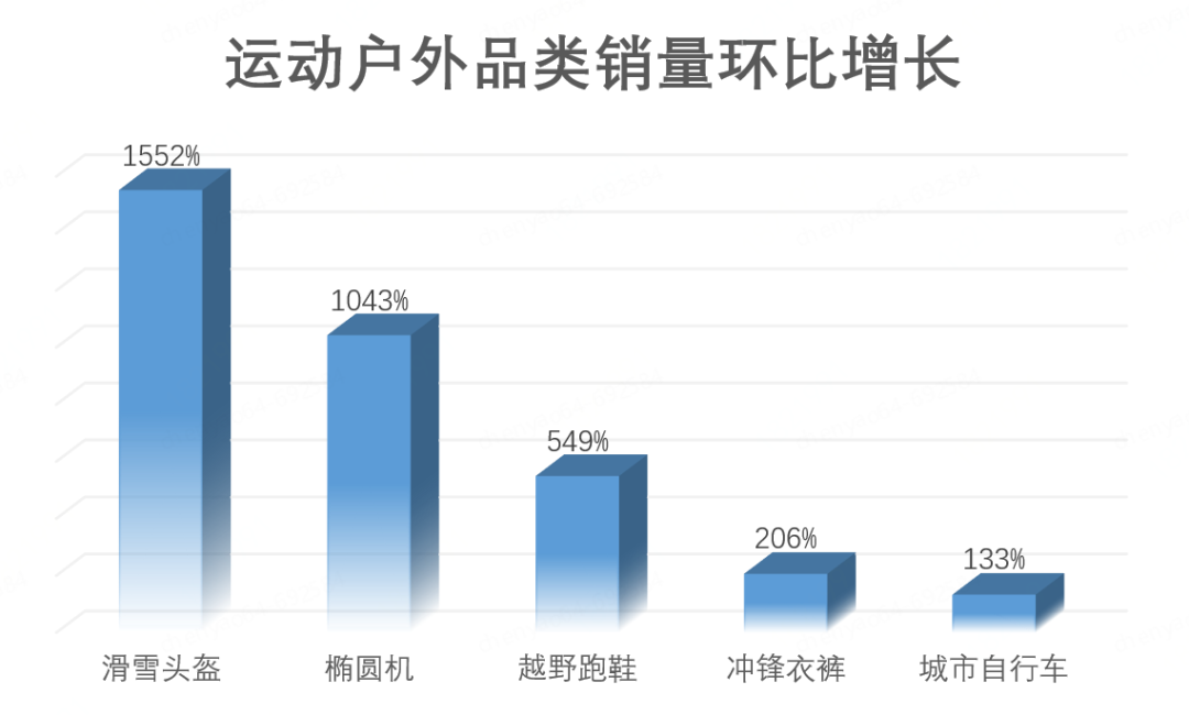 运动装备也成为七夕热销的礼品。滑雪头盔、椭圆机销量环比增长超过10倍,城市自行车、冲锋衣裤、椭圆机等销量环比都出现了高倍增长趋势。