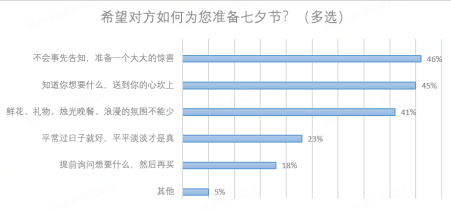 曾经有一首流行歌名字叫“女孩的心思男孩你别猜”,爱情中的人很多心思不好意思表达,另一方想猜又猜不准。在回答“希望对方如何为您准备七夕节?”的问题时,46%的受访者希望对方“不会事先告知,准备一个大大的惊喜”;45%的受访者希望对方“知道自己想要什么,礼物能送到心坎上”;41%的受访者希望对方准备“鲜花、大餐等营造浪漫的氛围”。