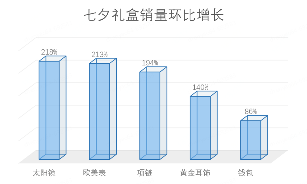七夕来临前,商家们准备了众多精美的节日礼盒。其中,化妆品套装/礼盒的销量最高,占比达到22%,其次是口红、香水、男士皮带、面部精华礼盒。从消费增长的角度来看,太阳镜、欧美表、项链礼盒销量环比增长近200%,黄金耳饰、钱包销量环比增长140%、86%。