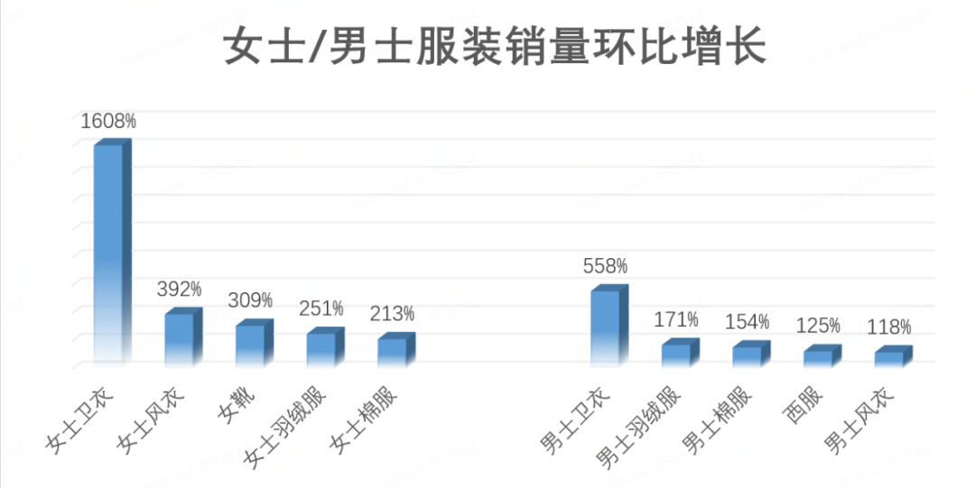 服装也是节日一种贴心的礼物。正值新一年的秋装、冬装上市,女士服装中,卫衣销量环比增长16倍,风衣销量环比增长近4倍;男士服装中,卫衣销量环比增长558%,风衣、西服销量环比增长超过100%。