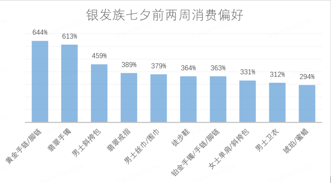 银发族在这个七夕节前的消费也很活跃。他们在黄金手链、翡翠手镯、斜挎包等商品的消费偏好较高,银发族在七夕前购买男士丝巾/围巾、男士卫衣的消费占比高于全站,同时,银发族喜爱的徒步鞋、琥珀/蜜蜡等也在七夕节前畅销。