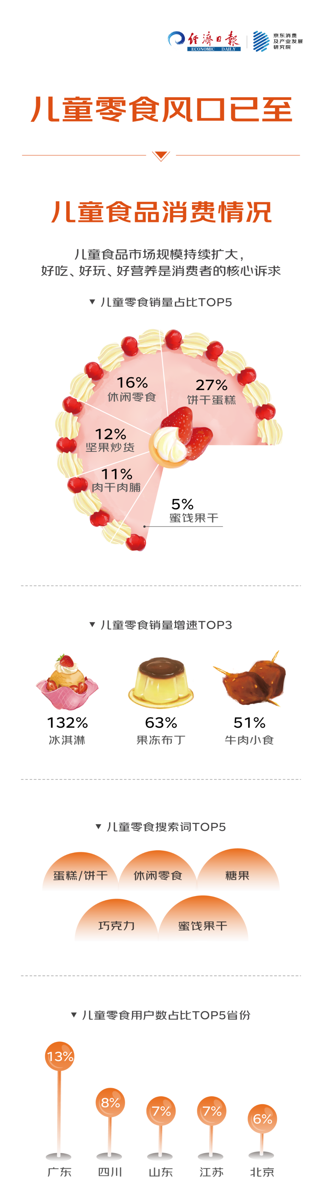 数据显示,“六一”国际儿童节儿童零食消费增长迅速,销量环比增长47%。其中,饼干蛋糕、休闲零食、坚果炒货最受小朋友们欢迎,销量占比分别为27%、16%和12%。此外,冰淇淋、果冻布丁、牛肉小食等品类也迎来飞速增长,成交额环比分别增长132%、63%和51%。