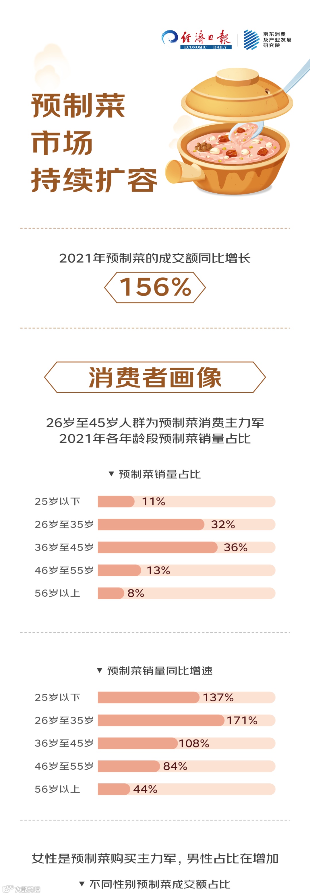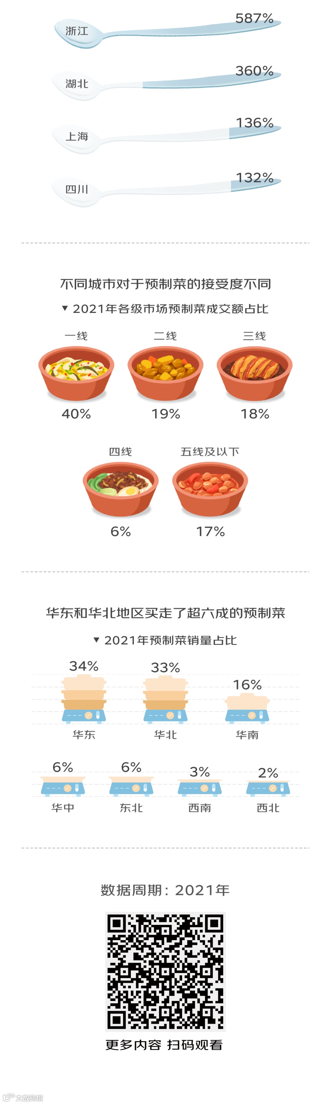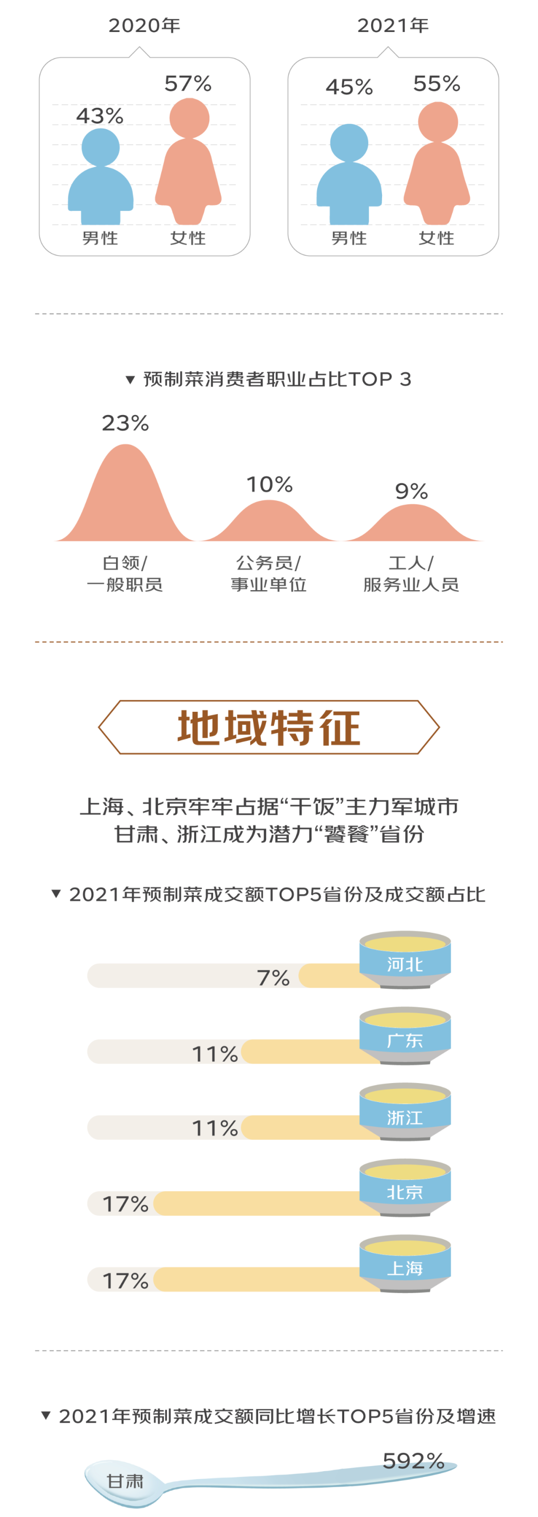 当前,购买预制菜的消费者中,中青年人群占比最高。经济发达地区是预制菜的主要消费区域。目前,预制菜的销售主要集中在华东和华北地区,2021年一二线城市预制菜成交金额占比达60%。“烹饪方便简单”“省时省力”“不会做饭也可尝试”“味道不输饭店”,从消费者的评价来看,解决“不会做、不好吃、没时间”的厨房难题,是预制菜获得消费者青睐的重要原因。
