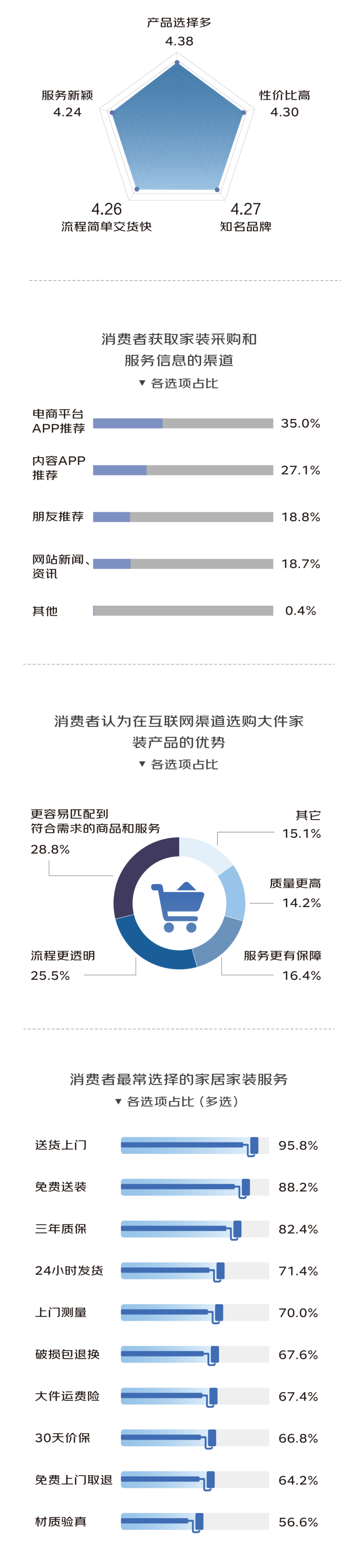 调研数据显示,“没保障”“不透明”“套路多”等涉及服务的问题最让消费者头疼。而纵观家装市场的发展演变历程,从施工队到装修公司再到电商一体化服务,从标准化产品到多元化需求,整个行业已经进入到精细运营的时代,服务已经成为核心竞争区。