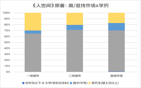 从上图可见,在二线城市、县域市场中,高中及本专科学历的读者占比超过了一线城市中的比例,而一线城市的高学历(研究生)占比最高;说明在广大中、低线中市场中,民众对优秀文艺作品以及精神文化的需求非常迫切。