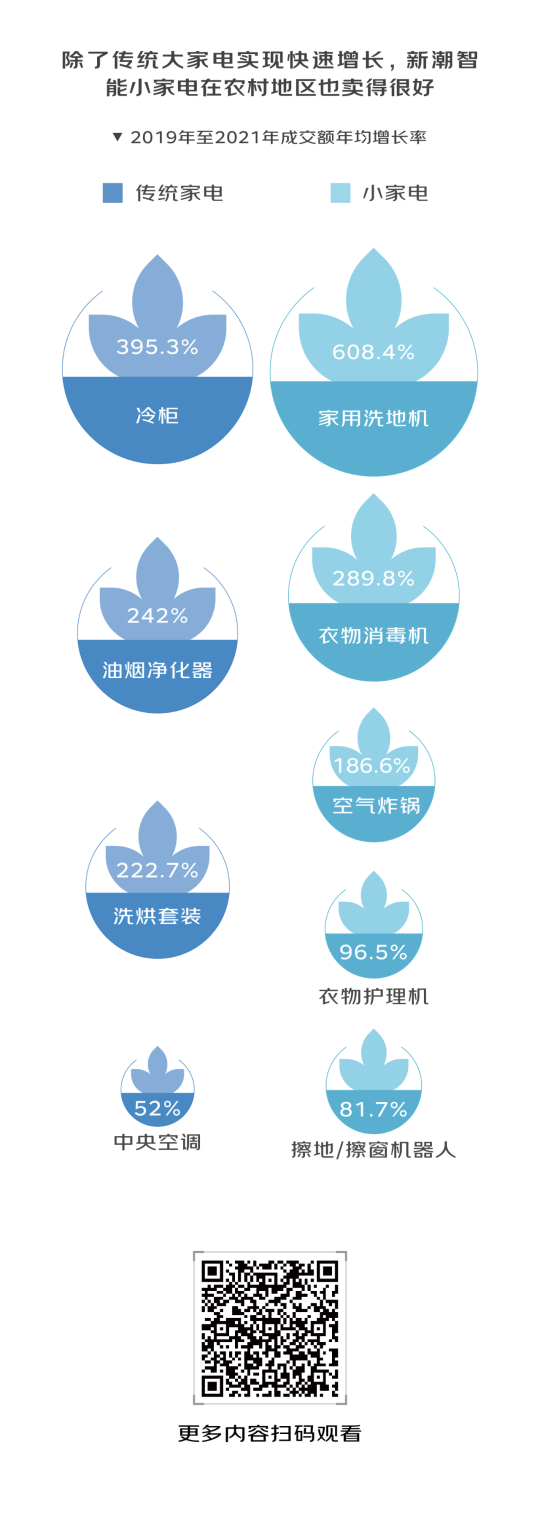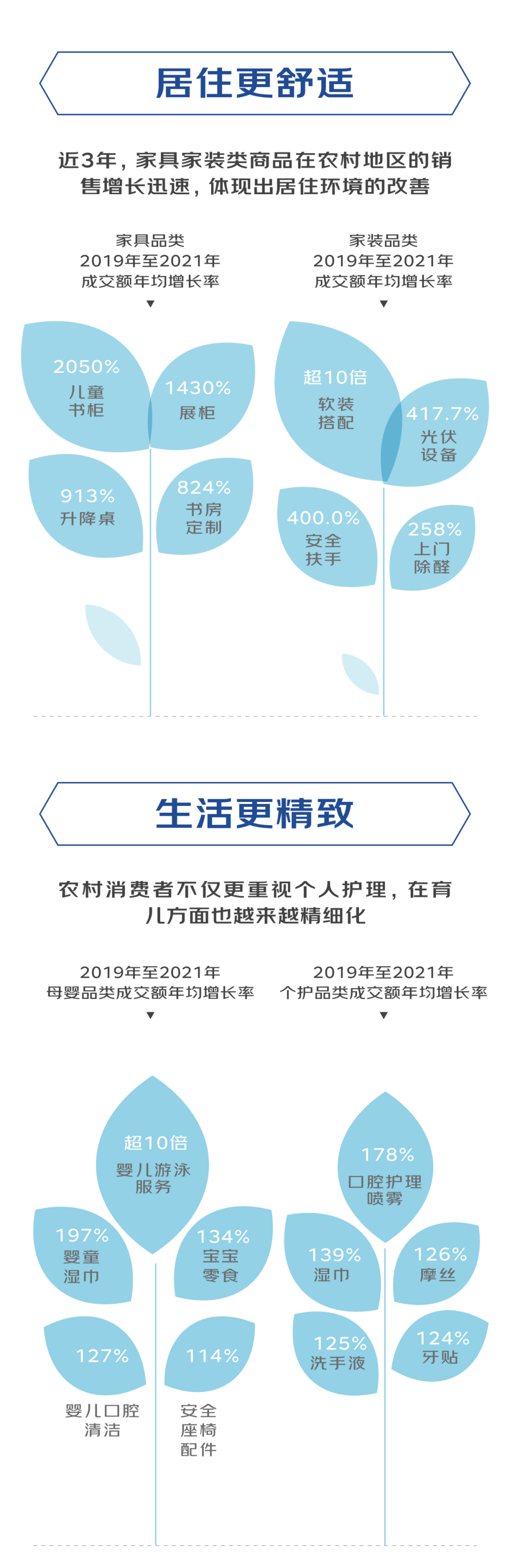 此外,随着县域农村地区教育水平和收入的提升,新一代农村父母更注重育儿产品品质与精细化,并且对自身护理标准不断升级。数据显示,近3年县域农村地区个人护理、母婴育儿等商品销售增速显著提升。