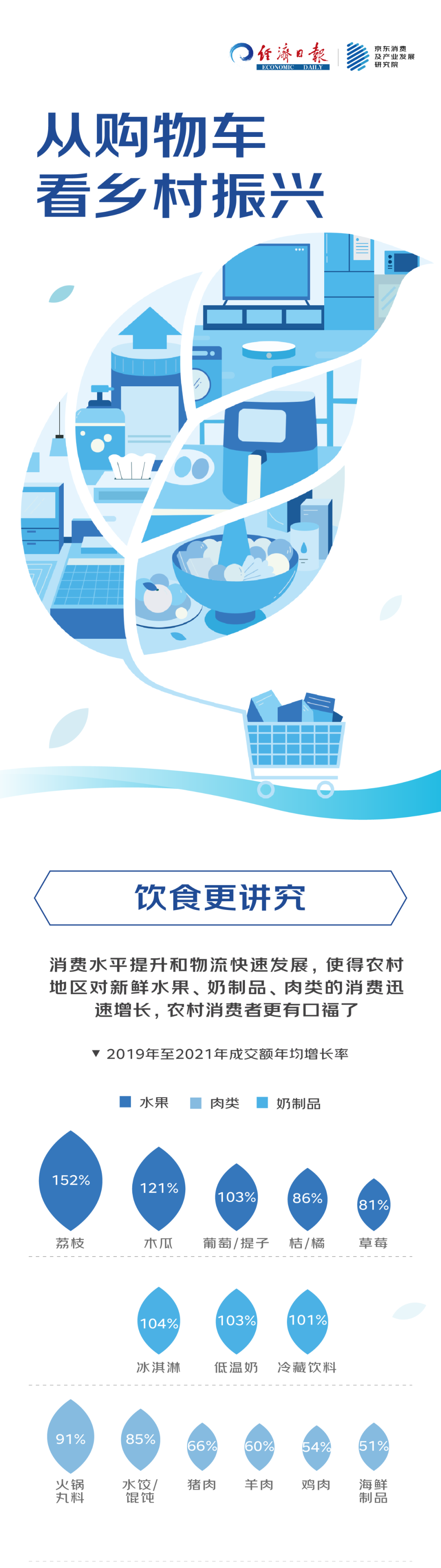 从食品消费的维度观察,随着线下实体商业与线上网络购物进一步融合发展,农村生鲜供应链的软硬件条件加速升级,越来越多的进口海鲜、热带水果等产品,以更亲民的价格、更新鲜的品质走上县域农村消费者的餐桌,成为农村消费者尝鲜试水的新选择。因此,对于生鲜食品供应商来说,加快提供海鲜活鲜、速冻食品、时令果蔬等商品种类,拓展多样化供给渠道,这些将成为农村食品消费的新机遇。