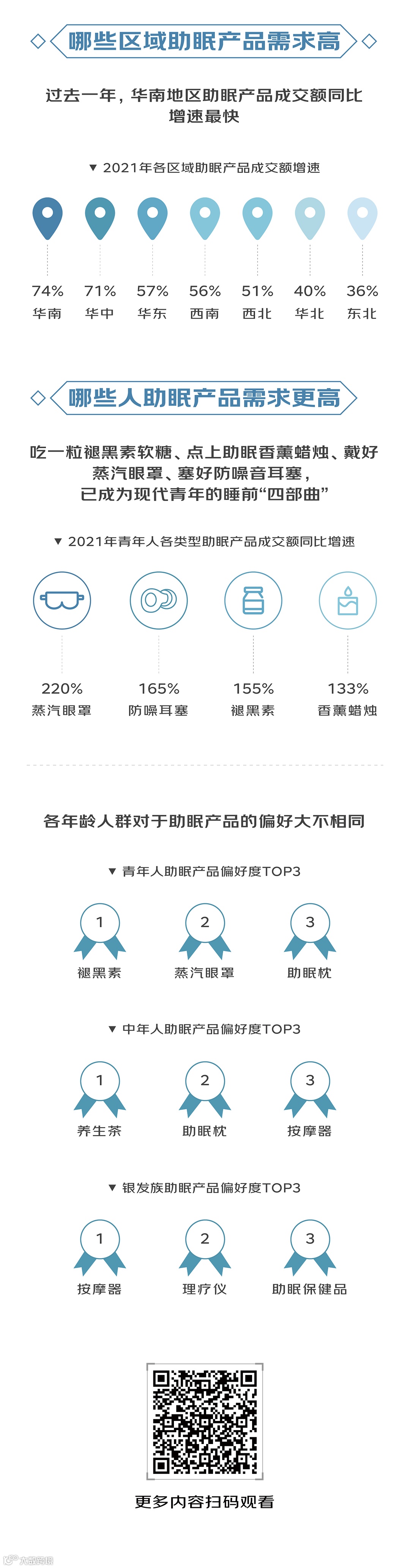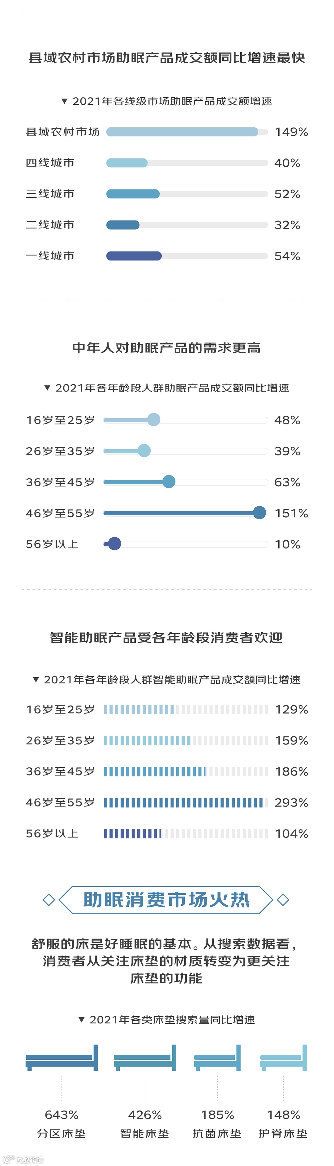 此外,助眠产品的消费人群也在不断拓展。从区域来看,县域农村市场潜力十足。县域农村地区居民购买力不断上升,提升生活品质成为主要消费动力,在睡眠消费上的诉求也发生转变。数据显示,2021年县域农村市场助眠产品成交金额同比增长149%,增速远超一线至四线城市。相关厂商可以研发和生产更多符合县域农村市场睡眠消费需要的产品,更好满足这一消费群体提升睡眠质量和生活品质的诉求。