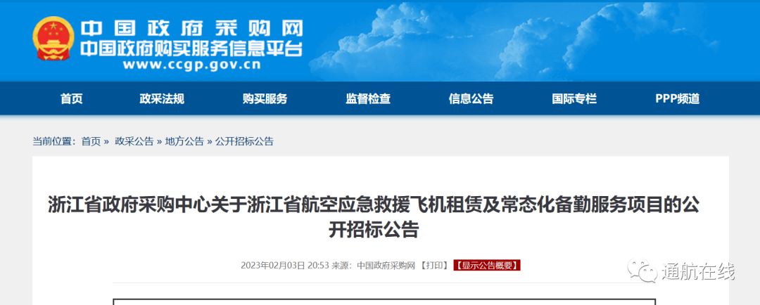 浙江省航空应急救援飞机租赁及常态化备勤服务项目招标项目的潜在投标人应在浙江政府采购网获取(下载)招标文件,并于 2023年02月24日 09:00(北京时间)前递交(上传)投标文件。