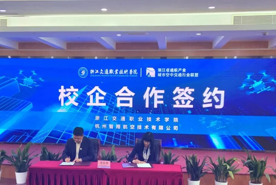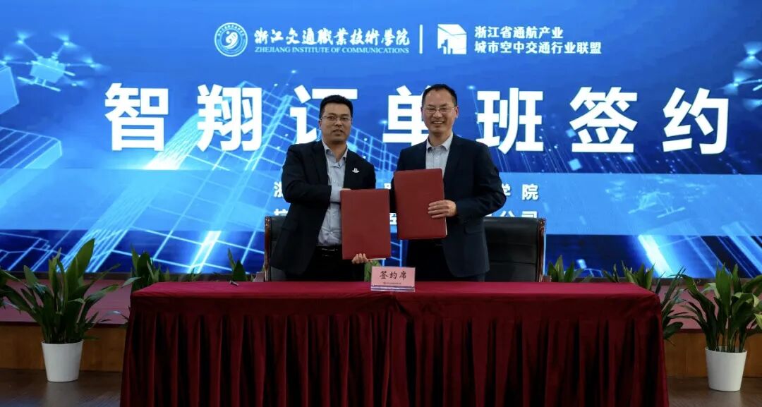 浙江交通职业技术学院院长陈凯与杭州智翔航空技术有限公司总经理程苏仙签订校企合作协议。航空学院院长章正伟与智翔航空副总经理牛炯博士代表双方签署了订单班协议。