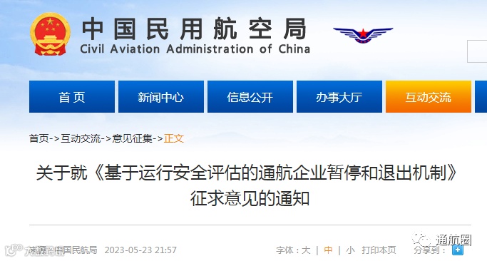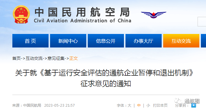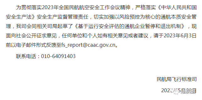5月23日,民航局飞标司发布通知,就《基于运行安全评估的通航企业暂停和退出机制》面向社会征求意见,意见反馈截止时间为2023年6月3日。据了解,为贯彻落实2023年全国民航航空安全工作会议精神,严格落实安全生产监督管理责任,切实加强以风险预控为核心的通航本质安全管理,民航局结合我国通航企业运行实际,决定建立基于运行安全评估的通航企业暂停和退出机制。《基于运行安全评估的通航企业暂停和退出机制》旨在通过对通航企业安全运行能力的检查和评估,指导地区管理局及时发现并依法处理存在重大安全风险的通航运行活动,引导行业逐步形成“优胜劣汰”的通航运行环境,以适应新形势下的安全监管要求,为市场资源配置优化提供参考,促进通航企业持续安全健康有序发展。