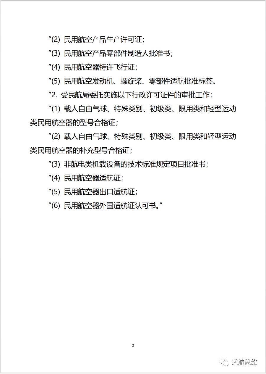 (一)明确民航局负责对全国范围内适航审定行政许可及其相关活动实施统一监督管理,并明确其负责审批工作的行政许可证件的范围。