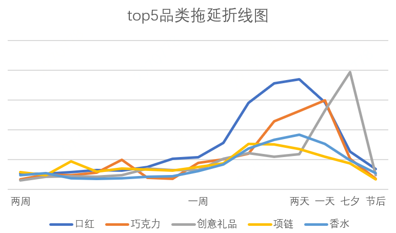 购买创意礼品的人基本会拖到当天进行购买,看来创意礼品比较利于即使救场;其次的救场礼品是巧克力,在七夕前一天突然想起来要过节紧急下单;口红和香水持平。