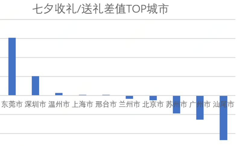 用收到七夕礼物比送出异地礼物来衡量,比值差异最大的城市排行第一名是东莞市,看来这top5的城市在异地都有很爱自己的爱人,收到的礼物要远高于送出的礼物,幸福感很高,而北京、苏州和广州更愿意付出,送给爱的人礼物。