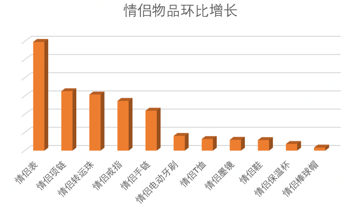 情侣款的商品,在中国情人节也会热卖,穿着情侣衫走在街上,家里摆着情侣物品,给日复一日的生活增添了不少的情趣和仪式感。“情侣装、情侣服饰、情侣款”的同比增长极大。