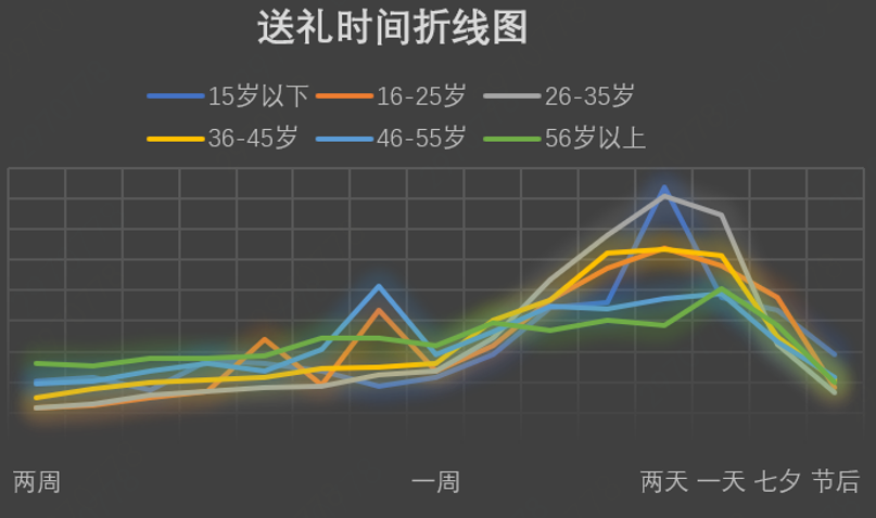 36-45岁在七夕前三天购买的人数比较平均,包括七夕当天在内约占全部的40%;46-55岁在提前一周有一个购买礼物的高峰期,更倾向于提前准备;56岁以上的相对比较平缓,从两周前到当天准备礼物的人数比较平均。