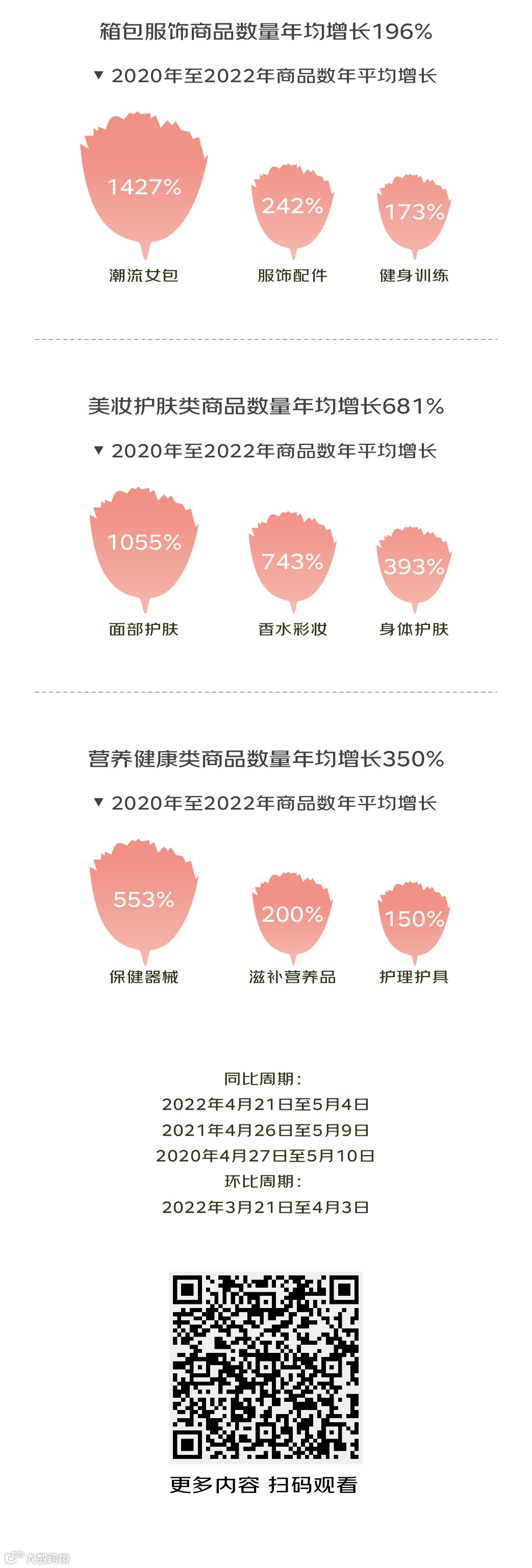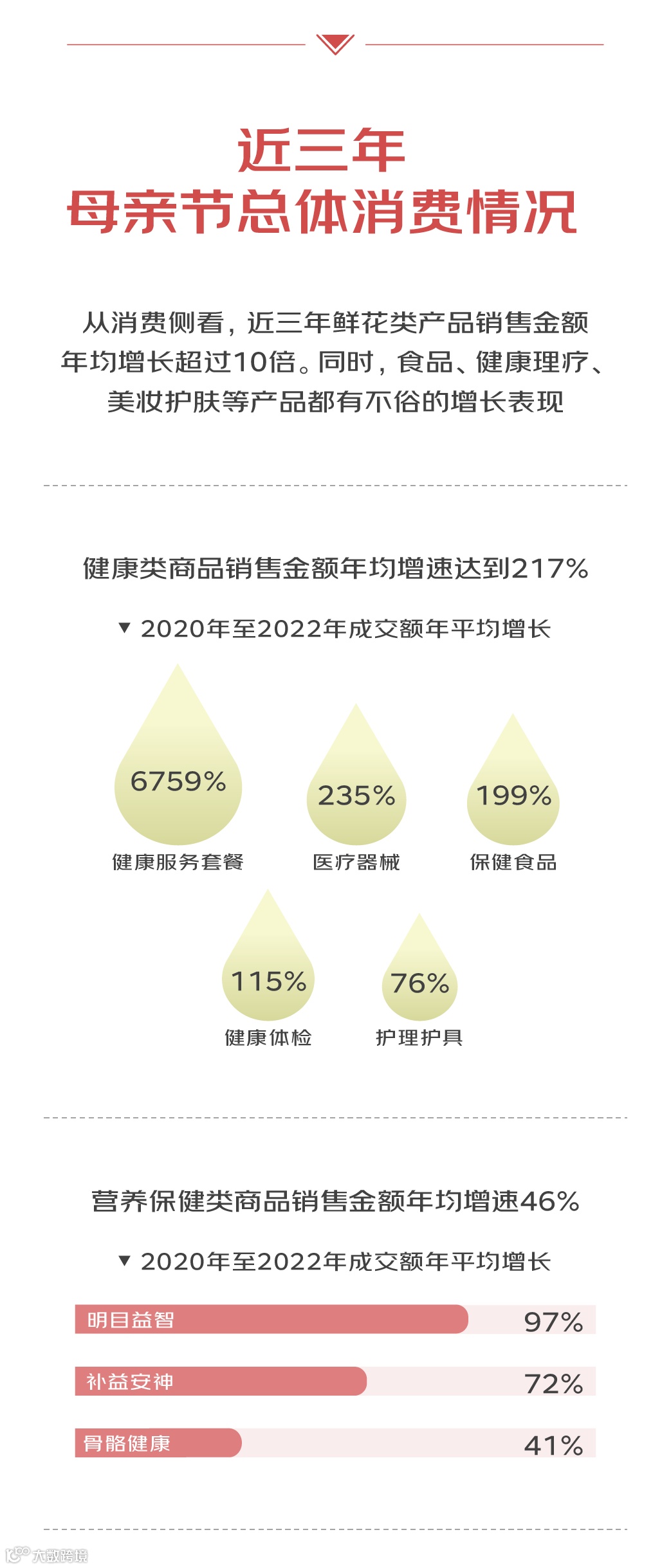 健康是儿女对长辈最大的祝愿。作为实用性的代表,“送健康”是节前消费的热门,健康服务、滋补养生品消费增长明显。数据显示,近3年母亲节前,健康类产品成交额年均增速达到217%,健康服务套餐成交额年均增长68倍。